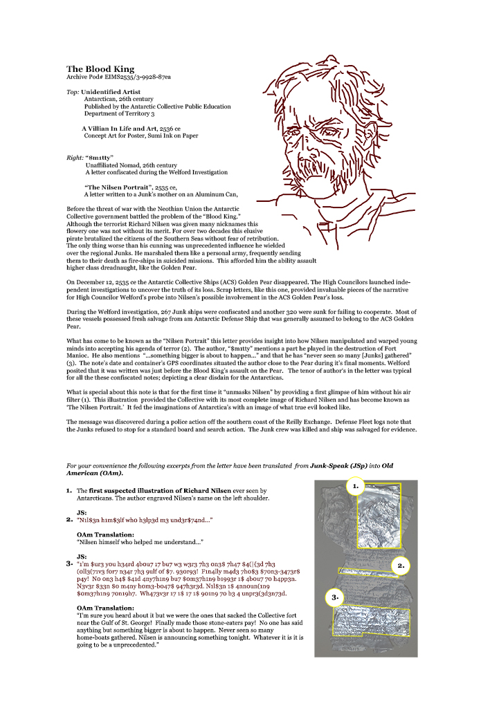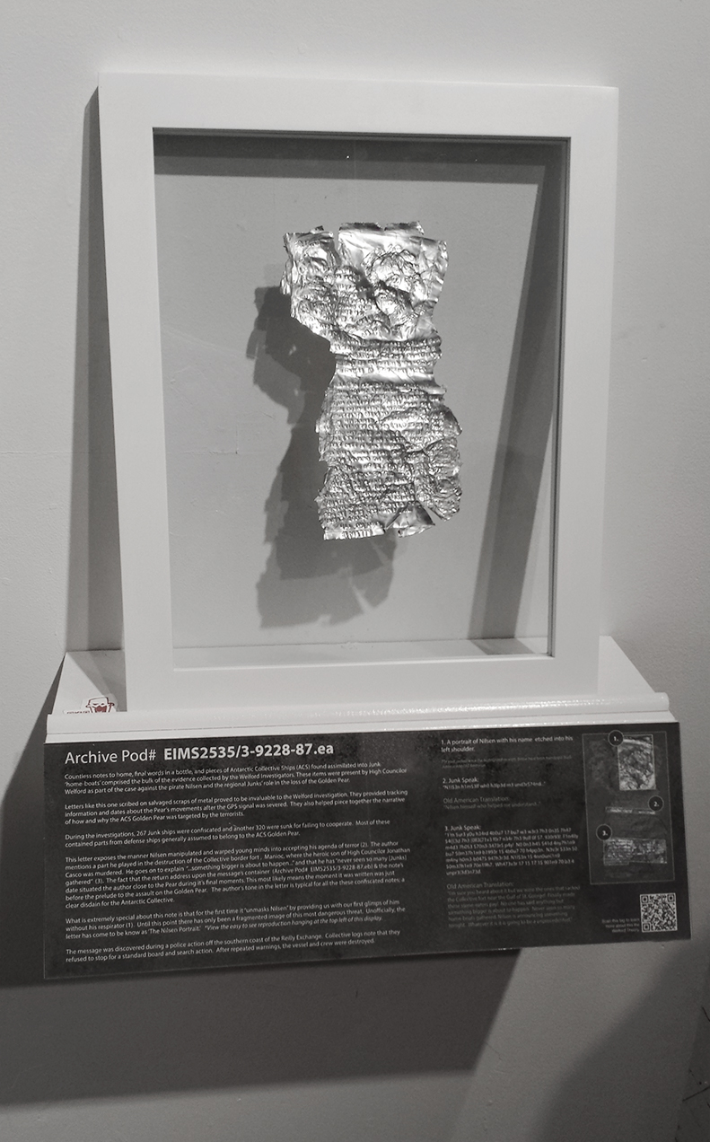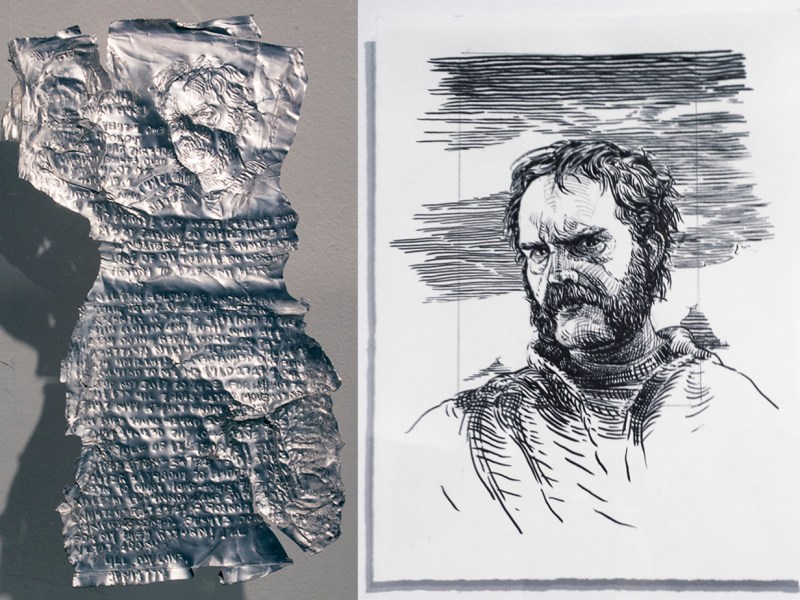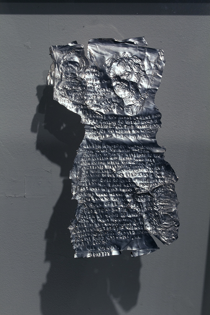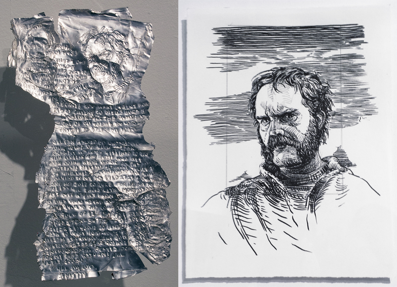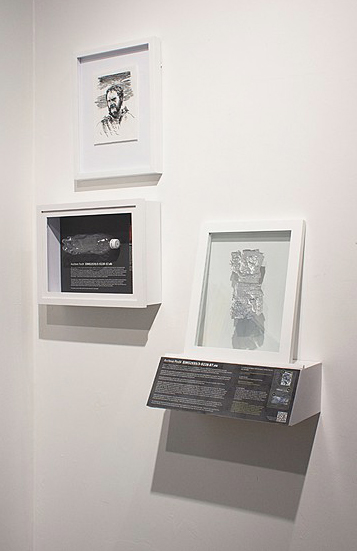 Archive Pod# EIMS2535/3-9228-87.es (Nilsen Portrait) The Dreadnaught Saga. Evidence Pod EIMS2535-3-9228-87.e (The Nilsen Portrait), 2014-15, 6″ x 3″ & 6″ x 4″ inches, etched aluminum can and graphite & sumi ink on paper | exhibition view Details & installation Related