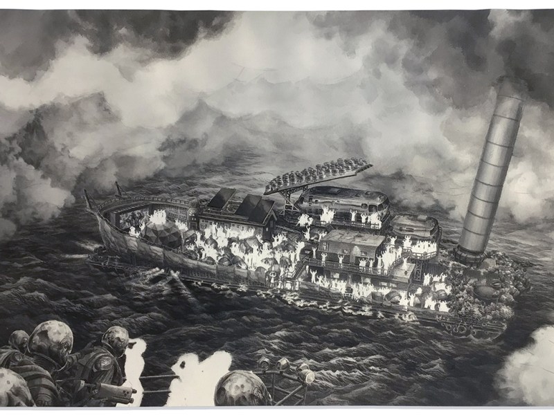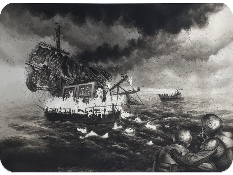 Redacted Confiscated Vagrant Vessel #66 Confiscated Vagrant Vessel Series, The Dreadnaught Saga. Redacted Confiscated Vagrant Vessel 66, 2020, 25″ x 15 1/8″ inches, acrylic ink and graphite on paper Related