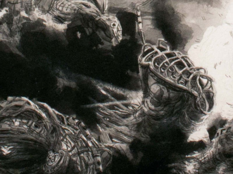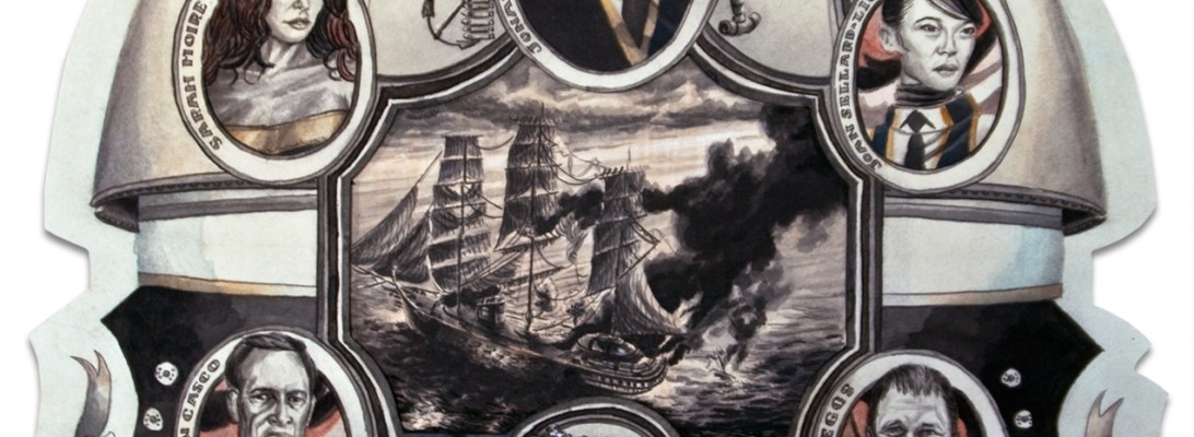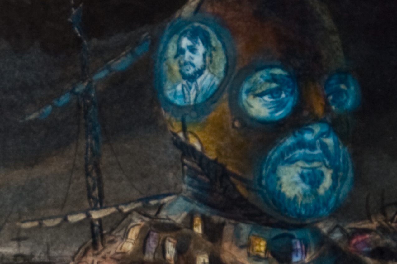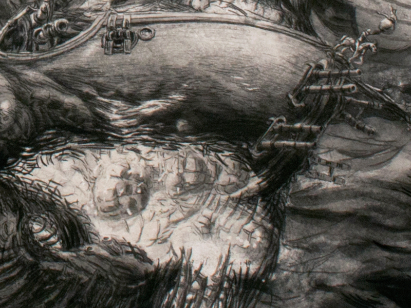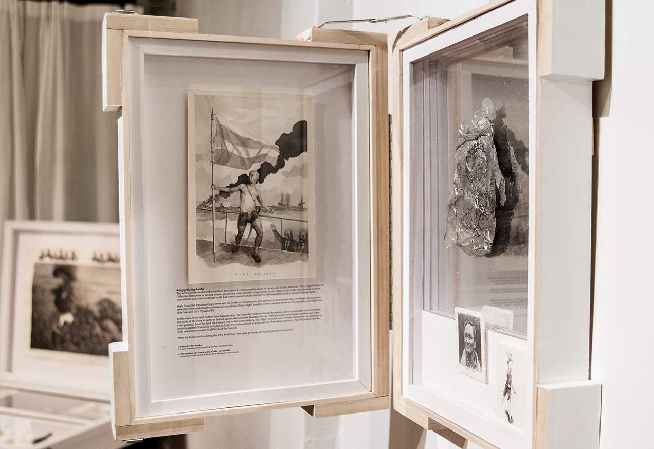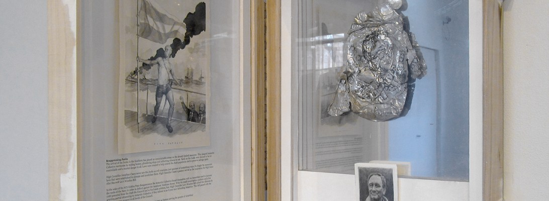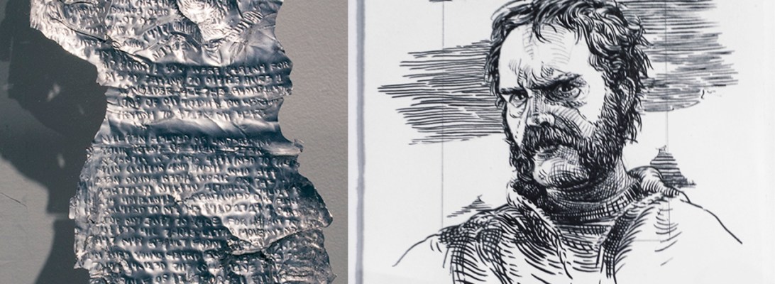 Evidence Pod EIMS2535-3-9228-87.e (The Nilsen Portrait), 2014-15, 6″ x 3″ & 6″ x 4″ inches, etched aluminum can and graphite & sumi ink on paper | exhibition view