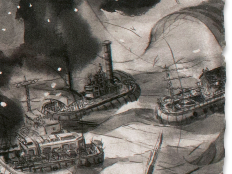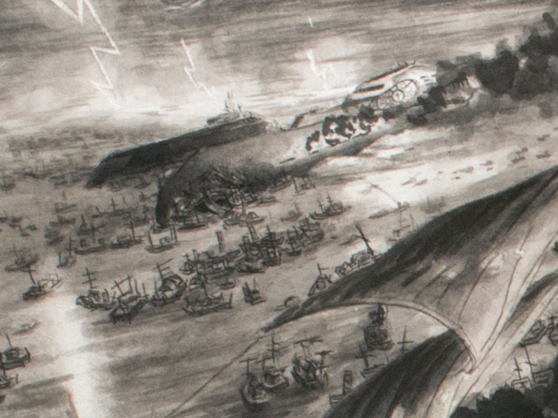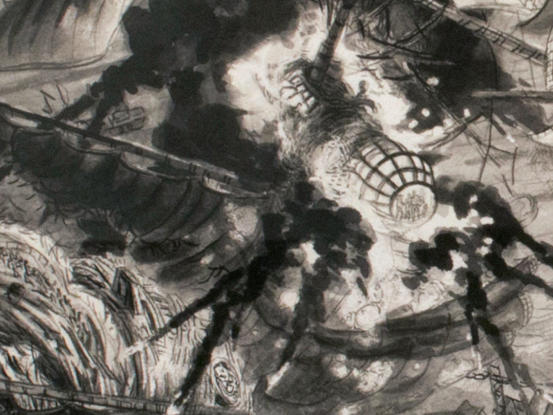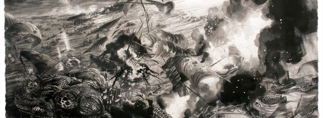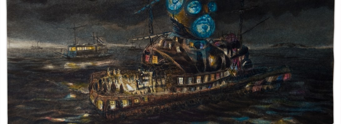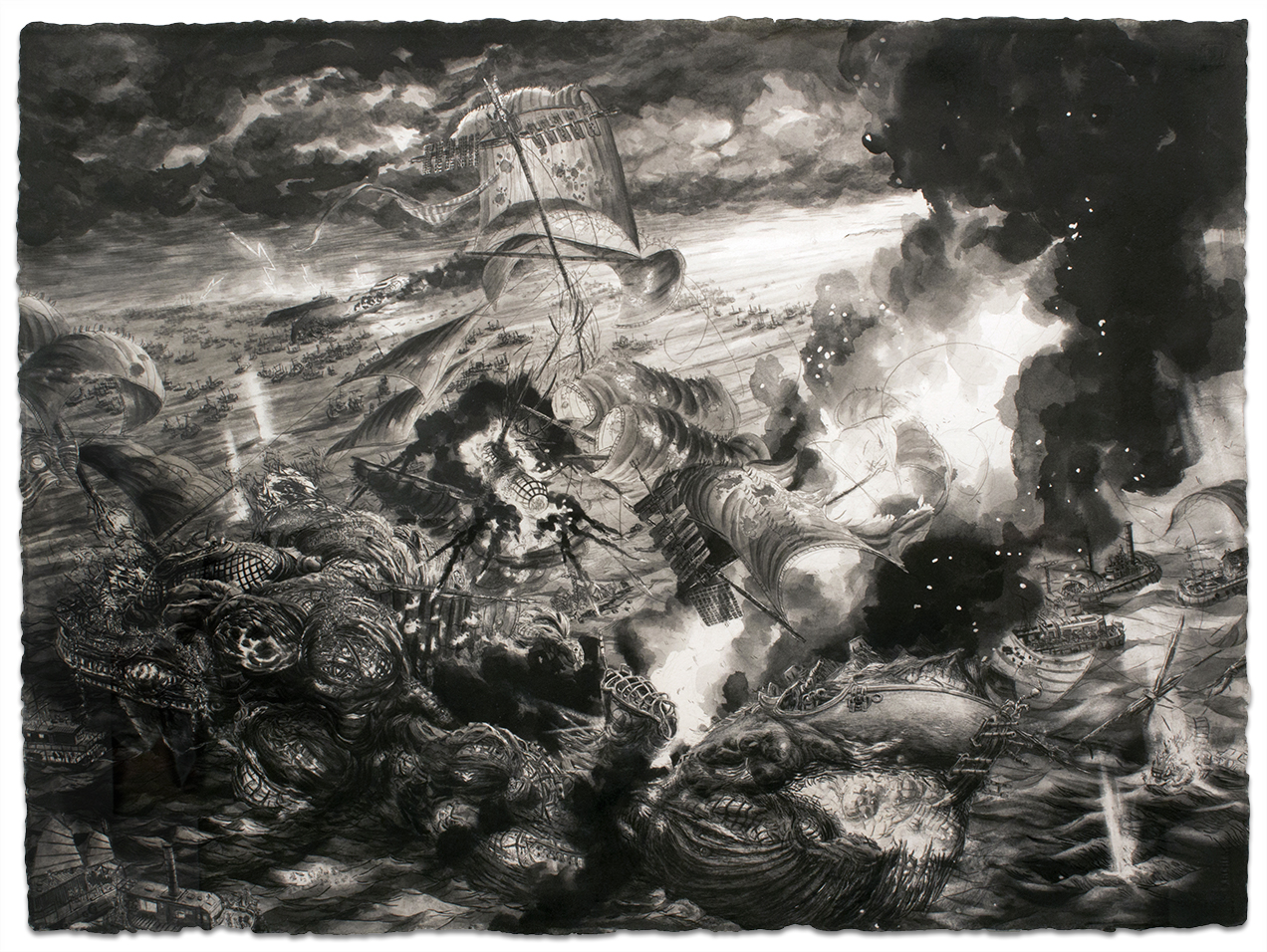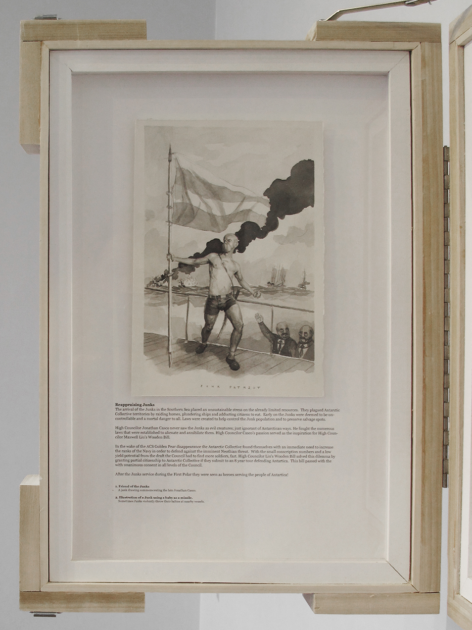 The Welford Theory About the Missing Golden Pear (version 2), 2011-2012, 22″ x 42″ inches, graphite, sumi ink and watercolor on paper, private collection | installation view